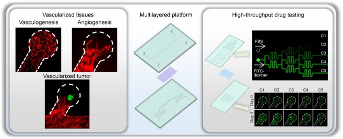 微流控器官芯片平台通过多孔膜和毛细作用实现三维血管化微组织建模,可精准模拟血管生成、肿瘤血管形成及药物响应过程,为癌症研究提供新策略,并支持多器官高通量药物筛选。