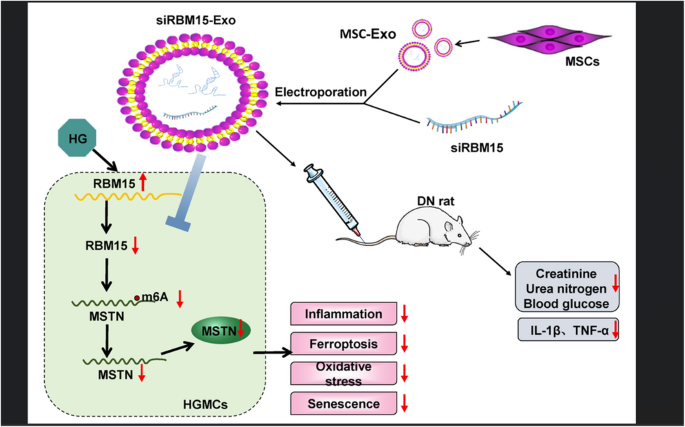 糖尿病肾病(DN)的进展与RNA结合蛋白15(RBM15)和Myostatin(MSTN)相关。本研究构建siRBM15-外泌体通过沉默RBM15抑制MSTN表达,缓解高糖诱导的HGMCs纤维化、炎症及氧化应激,并在DN大鼠模型中验证其疗效,揭示RBM15通过m6A甲基化稳定MSTN mRNA的机制。