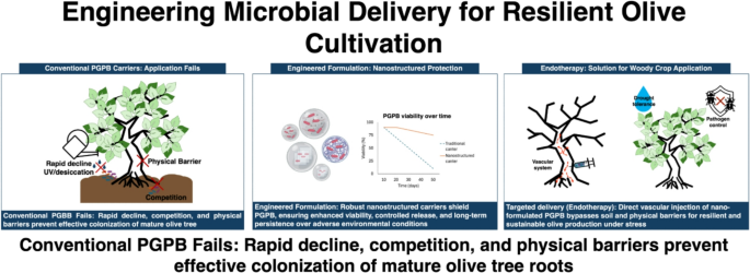地中海地区的橄榄种植是当地农业的支柱,但正日益受到集约化农业实践、新出现的血管疾病以及严重气候变化(尤其是干旱和高温)的威胁。微生物生物刺激剂,特别是PGPB(植物生长促进细菌),通过增强营养吸收、提高抗逆能力并赋予宿主树木生物控制能力,提供了一种关键且对环境有益的解决方案。早期针对欧橄榄(Olea europaea)的研究证实了这些有益微生物在支持橄榄健康方面的巨大潜力。本文认为,传统PGPB应用方法(如土壤灌施)在成熟橄榄园中普遍失败的原因主要并非生物学问题,而是一个工程学上的挑战。现有方法无法有效克服地下恶劣环境、强烈的本土微生物竞争以及树木成熟根系和茎干的物理屏障。为了充分发挥PGPB在可持续橄榄生产中的作用,需要从根本上调整研究重点。未来的策略应聚焦于先进的工程解决方案:(1) 开发坚固的、具有保护性的纳米结构载体,以确保微生物在恶劣环境中的存活率和可控释放;(2) 创新非根部输送系统,尤其是血管内输送(内疗法),以绕过土壤屏障并精准作用于树木的维管系统。本文综合了PGPB在橄榄产业中的生物学潜力,批判性地分析了传统应用方法的失败原因,并提出了以工程化输送系统为核心的全面研究议程,这是实现气候变化背景下橄榄种植可持续发展的关键。