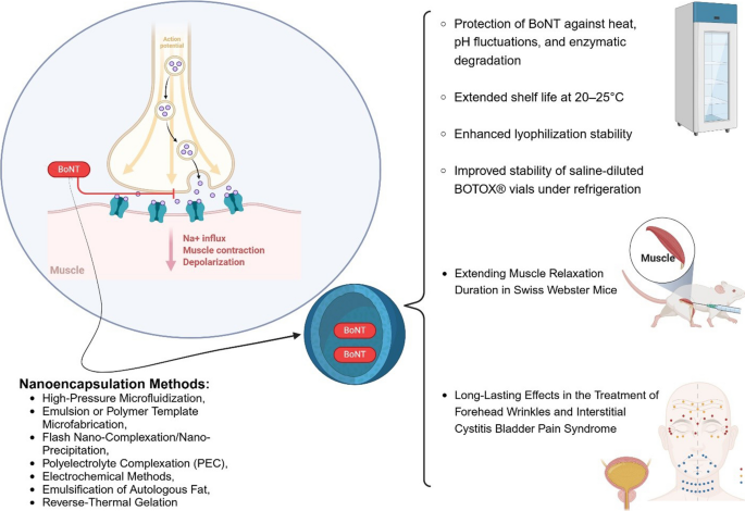 纳米肉毒杆菌毒素在耐热性、pH变化和酶降解方面表现出更好的稳定性。不同的纳米系统(10–300纳米)和聚合物微粒(<100微米),无论是通过肌肉注射、经皮给药还是局部应用,都能将作用时间从一周延长到超过11个月。基于银纳米粒子的稀释剂可将肉毒杆菌毒素的冷藏稳定性延长至3–4个月,其临床疗效也延长至超过11个月。纳米肉毒杆菌毒素的聚乙二醇衍生物也显示出了有希望的结果。