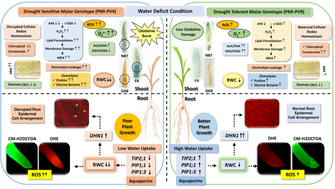玉米抗旱与敏感品系的水通道蛋白、脱水蛋白及抗氧化机制研究显示PMI-PV9通过调控离子-水平衡和膜稳定性增强抗旱性,而PMI-PV4因抗氧化防御不足导致氧化爆发,该研究首次整合红ox稳态、水通道蛋白和脱水蛋白表达机制解析玉米抗旱机理。