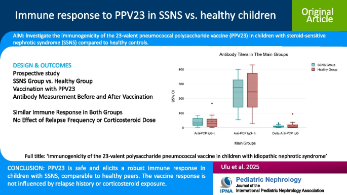 PPV23在SSNS缓解期是安全且具有免疫原性的,能够引发与健康儿童相当的免疫反应。重要的是,年龄较小时是抗体增幅的唯一独立决定因素——这一发现在该人群中较为新颖——强调了及时接种疫苗在疾病进展中的重要性。