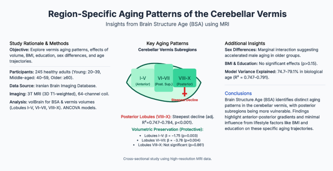 小脑下顶叶结构MRI分析显示, posterior lobules VIII–X老化最显著,前部和后上区域体积保存具有保护作用,性别存在加速老化差异,BMI和教育无显著影响。