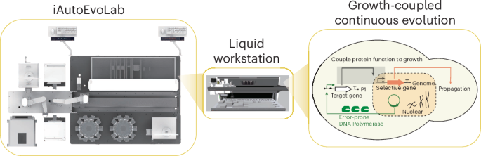 目前的蛋白质工程方法受到对序列-功能关系理解有限的制约,同时利用人工智能方法设计复杂蛋白质特性存在困难,且定向进化过程需要大量人力。为此,我们构建了一个工业级自动化平台,该平台具备高通量、高效率、高可靠性以及最小化人工干预的特点(可连续运行约1个月)。我们为OrthoRep连续进化系统开发了新的遗传电路,以实现具有多样性和复杂功能的蛋白质的协同进化。具体措施包括通过双重选择提高LldR对乳酸的敏感性,以及利用NIMPLY电路增强LmrA的特异性。我们将这些组件整合到一个名为iAutoEvoLab的集成实验系统中,成功将无活性的前体蛋白质进化为具有完整功能的实体,例如具备mRNA加帽功能的T7 RNA聚合酶融合蛋白CapT7,该蛋白可直接用于体外mRNA转录和哺乳动物实验。我们的系统是一种多功能蛋白质工程工具,有助于更深入地探究蛋白质功能的起源及其进化轨迹。