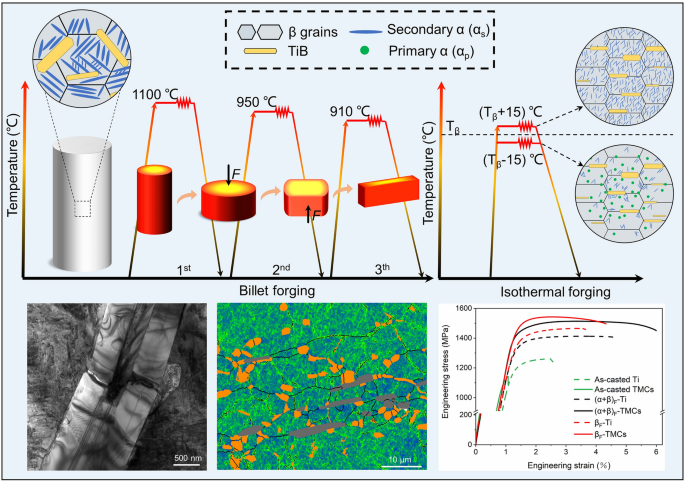 等温锻造在亚稳β钛合金及TiB/Ti-55531复合材料中调控微观组织,优化强塑性匹配,实现1514 MPa强度与6.7%延伸率。