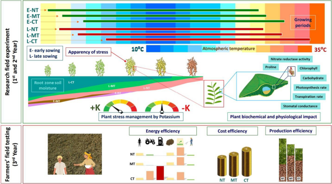 在印度,依靠雨养农业生产的扁豆为贫困人群提供了营养来源。然而,延迟且大规模的耕作方式不仅成本高昂,还会在植物生殖阶段引发水分胁迫。高温和水分胁迫会降低作物产量,而当这两种因素同时存在时,产量会进一步减少。从播种开始,通过合理的综合管理策略(包括耕作和养分管理),可能是解决这一问题的最佳途径。为了研究钾元素管理对扁豆植物生理和生化活动的影响,以及不同耕作方式和播种时间对这些影响的调控作用,并验证最佳处理方案在农民田间的实际效果,本研究在2016–2017年和2017–2018年设置了实验田,分别进行了两次扁豆播种(早播和晚播),采用了三种耕作方式[免耕(NT)、少耕(MT)和常规耕作(CT)],以及四种钾肥施用方案[不施钾(K0)、基施钾(Kb)、叶面施钾(Kf)和基施加叶面施钾(Kbf]。随后,在2018–2019年,将这四种最佳处理方案与农民的常规耕作方式结合,在五个农民的田地里进行了进一步验证。结果表明:常规耕作导致根区土壤水分含量降低(1.1 mm d?1),而少耕和免耕方式则使土壤水分含量比常规耕作高出13–16 mm。早播扁豆的土壤水分含量更高,其蒸腾速率(Tr)比晚播扁豆高出11–14%。在少耕条件下,最大气孔导度(Gs)达到242 mmol H2O m?2 s?1,蒸腾速率比免耕高出0.66 mmol H2O m?2 s?1》。常规耕作条件下光合作用速率(Pn)的下降幅度(33%至98%)相对较大,且光合作用速率与土壤湿度之间存在显著的正相关关系(R2 = 0.55)。尽管如此,基施加叶面施钾处理方式使蒸腾速率和光合作用速率分别比基施钾处理方式高出14%和12%。在整个生长期间,免耕方式的总碳水化合物(TC)含量最高;而常规耕作方式的脯氨酸含量比免耕方式高出29%。早播扁豆的硝酸还原酶(NRA)活性比晚播扁豆高出37%,少耕方式的硝酸还原酶活性则高出15%。无论是在实验田还是农民田地中,早播少耕方式均获得了最高的籽粒产量和最高的水分利用效率,并实现了最佳的成本效益比。在短季水稻种植后采用少耕方式,并配合基施加叶面施钾的管理措施,将是缓解水分胁迫的最佳方案;同样采用基施加叶面施钾的常规耕作方式也可能有效减轻水分胁迫。