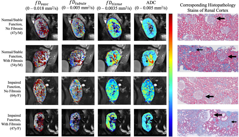 本研究针对肾移植后间质纤维化和肾小管萎缩(IFTA)这一预测移植肾功能下降的关键病理改变,开发了一种基于多b值扩散加权成像(DWI)的频谱扩散MRI技术。该前瞻性双中心研究纳入99例患者,结果表明频谱扩散参数fDtissue能有效检测肾功能正常(eGFR>45 mL/min/1.73 m2)患者的早期纤维化(AUC=0.72),并可识别轻度/中度纤维化(IFTA=2-4,AUC=0.65),而传统IVIM、ADC及临床指标均未表现出显著诊断能力。该技术为无创监测移植肾纤维化提供了新方法,有望实现慢性肾脏病(CKD)的早期干预。