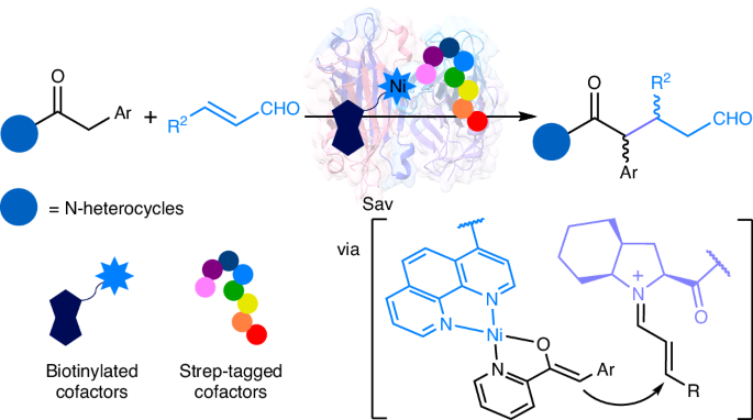 人工金属酶(Artificial Metalloenzymes,简称ArMs)为具有非生物活性的催化有机合成提供了有前景的工具。尽管协同催化已在小分子系统中得到广泛应用,但在人工金属酶中的应用却相对较少,部分原因在于在蛋白质骨架内组装协同辅因子的难度较大。本文报道了一种模块化合成方法,用于制备含有生物素化镍基辅因子和肽类辅因子的双辅因子人工金属酶,这两种辅因子均被固定在同源四聚体链霉亲和素(streptavidin)的相邻亚基上。这种协同作用的人工金属酶能够催化酮类与烯醛之间的不对称迈克尔加成反应,并通过化学遗传学优化提升了其催化性能。优化过程采用了高通量固相肽合成技术。机理研究揭示了协同作用的分子基础,以及关键突变在稳定辅因子和活性位点结构中的作用。值得注意的是,我们开发了两种互补的人工金属酶系统,可实现手性构建块的对映体选择性合成。这项工作为含有协同辅因子的人工金属酶的合成建立了一种通用策略,进一步拓展了生物催化不对称合成的应用范围。