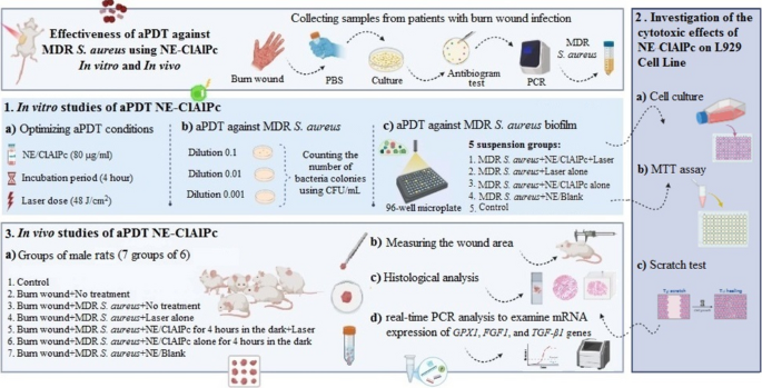 抗微生物光动力疗法(APDT)利用铝氯磷钴稳定于纳米乳剂(NE/ClAlPc)治疗耐多药金黄色葡萄球菌(MRSA)大鼠烧伤模型。体外实验显示8个数量级级细菌存活减少及60%生物膜代谢抑制,同时通过MTT和刮伤伤口实验评估细胞毒性和迁移能力。体内实验证实NE/ClAlPc显著缩小烧伤伤口面积,加速愈合,并调节FGF1、TGF-β1和GPX1基因表达。该疗法为替代传统抗生素提供了新思路。