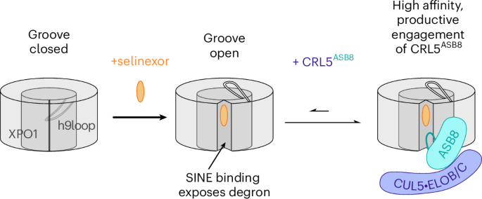 XPO1抑制剂通过结合 cryptic 结合位点诱导ASB8-CRL复合物介导XPO1泛素化降解,揭示合成抑制剂利用内源性代谢物(如4-octyl itaconate)激活的 allosteric 降解机制。
