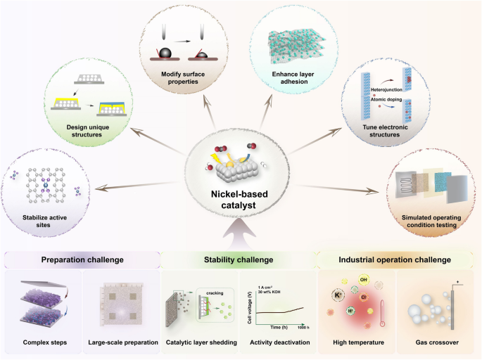 绿氢生产驱动碱性电解水制氢技术发展,镍基催化剂因丰度和活性优势受关注,但面临高电流稳定性差、活性位点调控难及规模化障碍。本文系统分析AWE与AEMWE机理,提出电子结构调控、活性位点稳定、传质优化及降解抑制策略,为工业级应用提供理论指导。