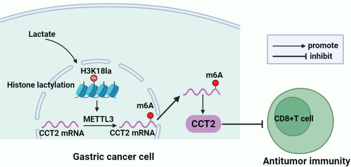 胃癌中组蛋白H3K18乳酰化升高促进肿瘤增殖并抑制CD8+T细胞活性,通过METTL3介导的m6A修饰增强CCT2表达,CCT2抑制Ca2+内流导致T细胞功能减弱,从而介导免疫逃逸和恶性进展。