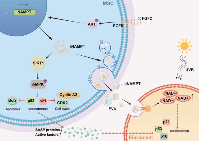 FGF2上调MSCs中的iNAMPT表达,并增强eNAMPT向成纤维细胞的传递,以实现MSCs分泌组的抗光老化效果。我们发现,成纤维细胞生长因子2(FGF2)通过FGFR/AKT通路提高MSCs中的NAMPT水平,从而以两种方式增强MSCs分泌组的抗光老化活性:一是上调的细胞内NAMPT(iNAMPT)激活AMPK通路,延缓细胞衰老、抑制凋亡并促进MSCs增殖;二是增强的eNAMPT通过细胞外囊泡从MSCs分泌组传递到成纤维细胞,增加成纤维细胞中的NAD+水平。最终,这两种方式共同导致p16、p21和p53蛋白的表达减少,从而使成纤维细胞增殖并抵抗UVB辐射。