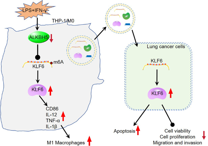 ALKB5的减少通过降低KLF6的甲基化程度来增加M1型巨噬细胞中KLF6的表达;KLF6被包装在M1型巨噬细胞外泌体中,并可通过外泌体转移到LUAD细胞中,从而抑制LUAD细胞的增殖、迁移和侵袭。