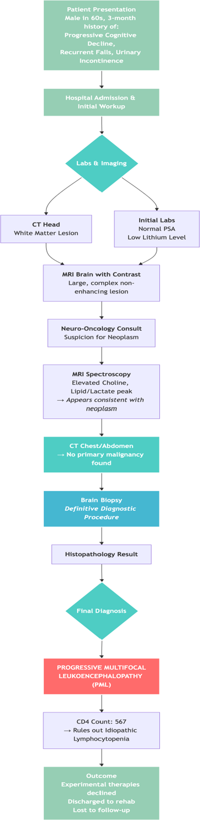 我们介绍了一位60多岁的男性患者,他有复发性转移性前列腺癌的病史,并正在接受亮丙瑞林注射治疗。他因意识改变、反复跌倒、尿失禁以及日常活动困难等症状被收入医院。他的妻子报告称他的认知能力逐渐下降,无法完成日常任务,记忆力减退,并且多次跌倒。在住院期间,发现他存在脑部病变,随后通过组织病理学分析确认为PML阳性。他的HIV检测结果为阴性,CD4细胞计数在正常范围内,为每微升567个细胞。