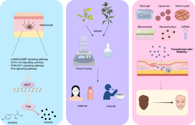 黑色素广泛存在于微生物至多细胞真核生物中,具有色素沉着、抗氧化、光保护及免疫调节功能,其生物合成通过酪氨酸在黑色素体中的复杂步骤实现。社会进步加剧了对皮肤美白和色素沉着的关注,引发对黑色素生成机制及抑制策略的深入研究。本文系统综述了黑色素沉积的信号通路、生成因子、天然活性成分及递送系统,并首次整合中草药配方、中医疗法和先进递送技术以增强中药透皮吸收,为美白及防色素沉着提供新方向。