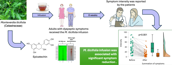 该观察性研究显示,60名成人患者使用蒙特维德利亚 ilicifolia 提取物后,整体消化症状评分平均下降25.21分(p<0.001),烧心和小腹不适改善最显著(中位数下降6分)。尽管医生对该草药疗效高度自信,但因缺乏培训而存在处方顾虑,色谱分析证实提取物符合巴西药典标准(含epicatechin)。