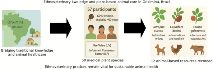 在巴西,尤其是下亚马逊地区,民族兽医实践仍然缺乏足够的记录,这凸显出对这些传统知识进行科学验证和保护的迫切需求。为了对巴西帕拉州奥里希米纳居民所采用的民族兽医知识进行编目、分析和传播,研究人员进行了57次半结构化访谈。数据分析采用了民族植物学指标,包括使用价值及信息提供者的共识程度,并通过t检验来评估性别和城乡居住环境之间的差异。共记录了50种植物,这些植物分布于44个属和32个科中。狗(59%)、鸡(18%)和牛(13%)是最常接受治疗的动物。报告的疾病包括腹泻、寄生虫病、皮肤病变、体外寄生虫病以及禽痘。皮肤疾病在信息提供者中的共识程度最高(0.78)。主要使用的植物包括:Jatropha curcas(使用价值=0.38),广泛用于治疗狗的寄生虫病;Copaifera duckei(使用价值=0.32),用于治疗呼吸系统疾病并具有驱虫作用;Bixa orellana(使用价值=0.29),用于治疗鸡的禽痘;以及Carapa guianensis(使用价值=0.23),既可用于治疗感染也可用于控制体外寄生虫。叶子是最常用的植物部位(34%),而茶是主要的制作方法(27%)。此外,还有12种脊椎动物和其他产品被报道为治疗资源。研究未发现城乡居民或男女在知识或实践方面存在统计学上的显著差异。这份关于奥里希米纳民族兽医实践的首份系统记录不仅展示了植物多样性与动物保健之间的联系,还强调了传统知识在可持续发展、生物多样性保护及农村兽医健康方面的更广泛重要性。