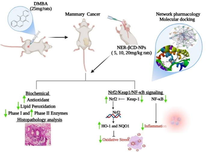 乳腺癌化疗纳米策略研究。采用网络药理学和分子对接技术,证实NER-βCD-NPs通过调控Nrf-2/Keap1/NF-κB信号通路,抑制DMBA诱导的大鼠乳腺致癌,降低脂质过氧化和增强抗氧化酶活性,并减少肿瘤负担和发生率。