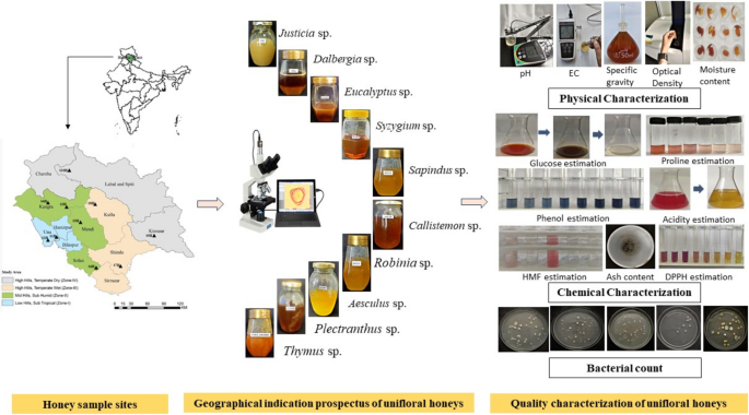 本研究对喜马偕邦不同气候带采集的10种单一花种蜂蜜进行显微分析、理化指标及矿物质检测,发现Robinia蜜酸度最低且新鲜度最优,Eucalyptus蜜富含脯氨酸,Justicia蜜矿物质含量突出,Thymus蜜具有高酚类和抗氧化成分,所有样品均符合FSSAI安全标准。其中Thymus和Plectranthus蜜源于西北部高海拔特有植被,适合地理标志认证及国际市场拓展。