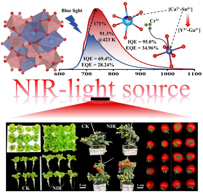 本研究通过化学单元共掺杂策略引入Ca2?和Sn??离子至garnet结构,开发了Y3?yCa[y]Ga4.95?ySn[y]G12:0.05Cr3?磷光体,发射波长范围708-768 nm。优化后的磷光体外部量子效率达34.96%,其增强源于八面体Jahn-Teller畸变,热稳定性(423 K时91.3%)归因于弱电子-声子耦合及氧空位缺陷。结合450 nm蓝LED芯片构建NIR pc-LED,电发光效率18.8%,淬灭率<5%/30天,适用于植物照明。