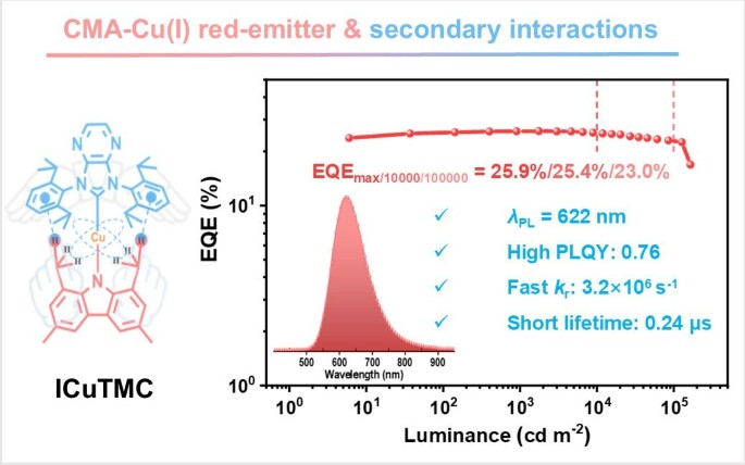 用于红色有机发光二极管(OLED)的短寿命TADF-Cu(I)复合物,其最大量子效率(EQEmax)为25.9%,在光照强度为10,000 cd m?2时亮度衰减小于2%