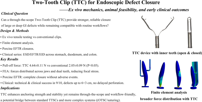 本研究开发新型双齿夹(TTC),经机械测试、有限元模拟及动物实验评估。结果显示TTC锚固力显著高于传统夹(4.64±0.11N vs 2.05±0.09N),动物实验证实其保持力强、组织相容性好。临床10例应用中9例成功闭合6×3cm缺陷,无迟发性穿孔。结论:TTC安全有效,双齿设计增强闭合强度与稳定性,需进一步对比研究。