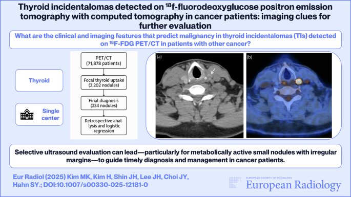本研究评估了癌症患者中1?F-FDG PET/CT检测的甲状腺意外瘤(TI)的恶性风险,发现结节大小<1.5cm、SUVmax≥6.25及不规则CT边缘是独立预测因素,并建议选择性超声检查以提高诊断效率。