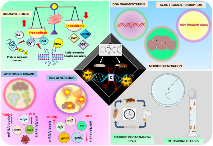 奥沙利铂在果蝇模型中表现出多年龄组及发育阶段的毒性效应,涉及DNA加合物形成、肠道细胞骨架破坏及氧化应激诱导的凋亡机制,并发现幼虫期行为异常与脑和肠道氧化应激相关,定量PCR显示抗氧化和凋亡基因表达随年龄变化。