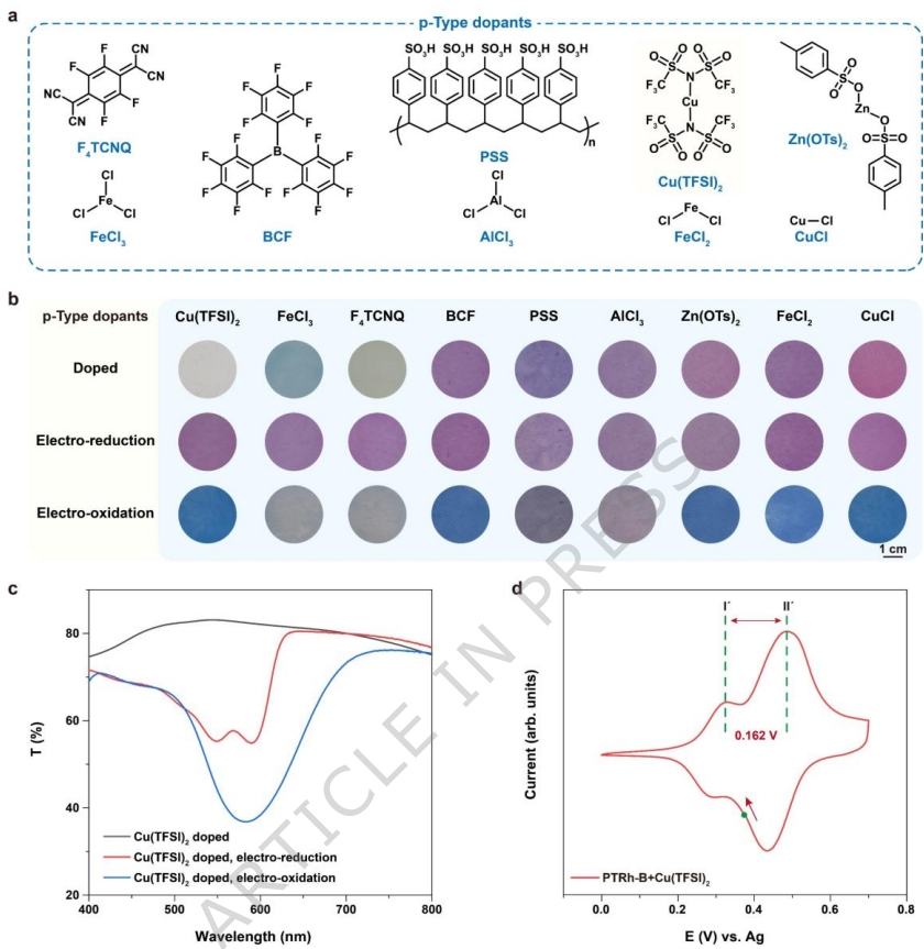 本研究针对透明电致变色(EC)显示器在实现高透光率与鲜艳多色切换方面的技术瓶颈,提出了一种基于罗丹明(rhodamine)与ProDOT(3,4-丙二氧基噻吩)单元整合的单分子设计策略。通过系统筛选分子掺杂剂(如Cu(TFSI)2),研究人员成功消除了色干扰,制备出具有三态光学特性(无色、品红、蓝色)的PTRh-B器件。该器件透光率高达80%,切换速度达0.13 s(无色-品红)和1.8 s(无色-蓝色),且具备多稳态特性(蓝色/无色态维持>5 h,品红态>30天)和超长循环寿命(>5,200/8,400次)。研究进一步实现了像素级显示原型,为透明节能显示和电子可擦写存储器提供了创新解决方案。