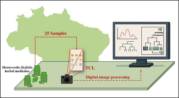Monteverdia ilicifolia(Mart. ex Reissek)Biral属植物,属于卫矛科(Celastraceae),俗称“espinheira-santa”,被列入巴西统一卫生系统(Unified Health System)关注的药用植物名录。由于其药理特性和成本效益,巴西公共卫生系统推荐使用由Monteverdia ilicifolia叶片制成的草药制剂,并将其广泛用于治疗胃炎、消化不良等胃肠道疾病。在公共卫生领域,亟需开发质量控制方法以确保这些草药制剂的品质。本研究分析了25种以Monteverdia ilicifolia叶片为原料的草药产品。所采用的方法结合了薄层色谱法(thin-layer chromatography)、计算密度测量(computational densitometry)和机器学习(machine learning),将样品分为四个不同的组别,这凸显了在巴西市场上销售的Monteverdia ilicifolia草药制剂质量控制措施的不足。研究发现,这些产品中的植物材料存在显著缺乏标准化的问题,其中所含成分及其含量在各个样品间存在较大差异,从而引发了严重的公共卫生隐患。