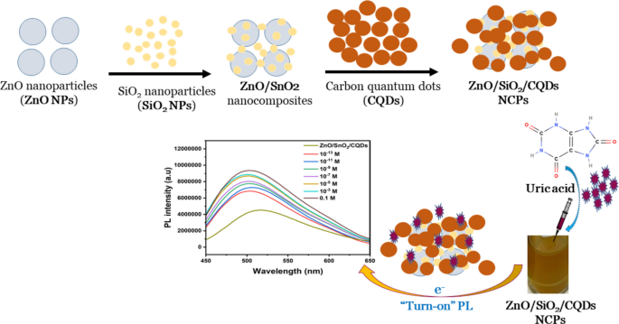 ZnO/SnO2/CQDs纳米复合材料(ZnO/SnO2/CQDs NCPs)用于尿酸检测的制备过程和传感机制的示意图。首先,使用水热法制备了ZnO纳米颗粒(ZnO NPs)和SnO2纳米颗粒(SnO2 NPs),而碳量子点(CQDs)则是以抗坏血酸作为碳源制备的。ZnO/SnO2/CQDs纳米复合材料是通过物理混合ZnO、SnO2和CQDs分散液形成的。插图中的光致发光(PL)光谱显示了明显的“开启”效应,即PL强度随着尿酸(UA)浓度从10–13 M增加到0.1 M而逐渐增强。这种开发的传感器具有高灵敏度和低检测限(LOD = 0.085 nM),显示出其在临床和生物医学应用中的潜力。
