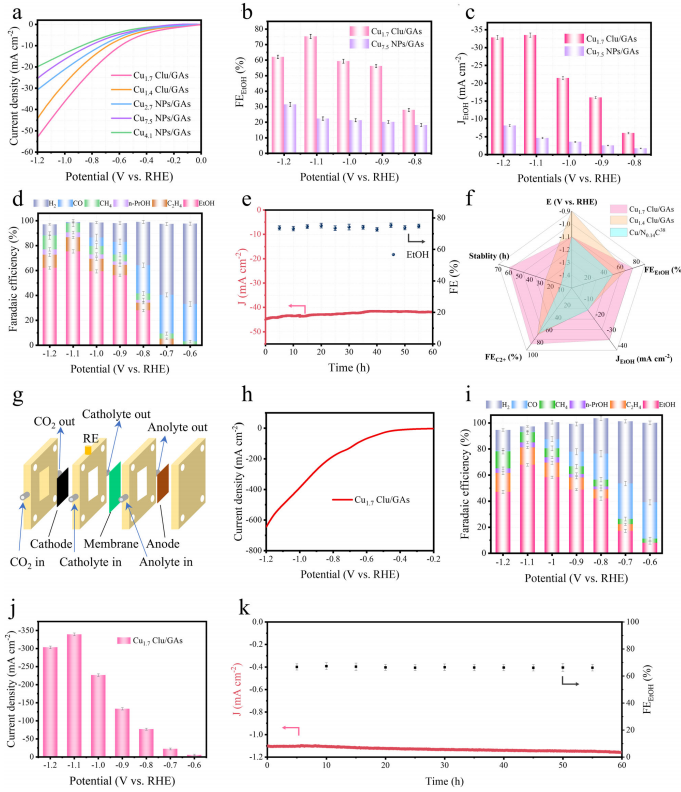 Cu1.7 Clu/GAs在-1.1 V时乙醇选择性达75.3%,多碳产物选择性90.5%,电流密度-33.5 mA cm-2,性能超越多数文献报道值。ECSA测试显示活性位点密度达108.8 m2 g-1。