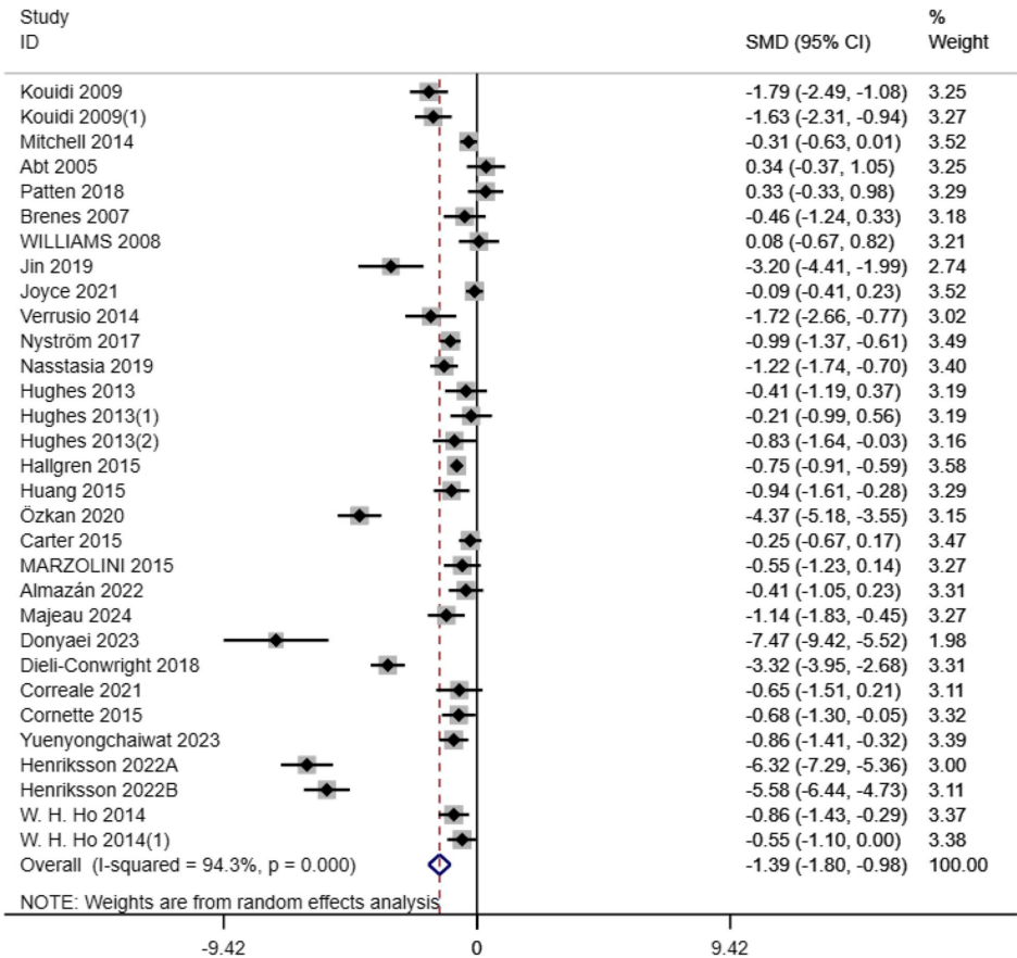 研究结果显示,RT+AE对抑郁症状具有显著改善作用(SMD=-1.39,95%CI=-1.80至-0.98)。