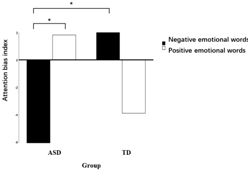 2×2混合方差分析显示,组别与情绪词类型存在显著交互作用(F=7.267,p<0.05,η2p=0.113)。简单效应分析发现,ASD患儿母亲对负性词的AB指数显著低于TD母亲(F=4.527,p<0.05),且呈现回避倾向(AB指数显著<0,t=-2.471,p<0.05)。