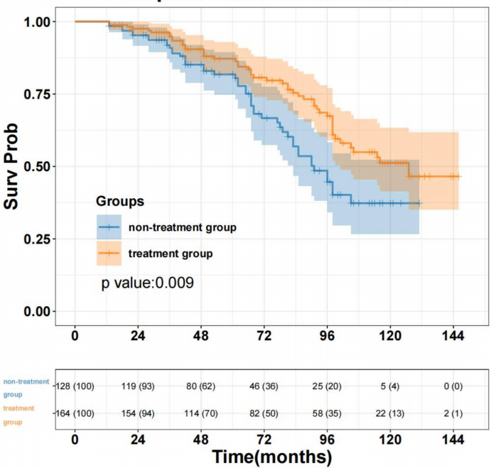 整体队列分析:IVC治疗组5年RFS达87.2%,显著高于未治疗组的81.8%(P=0.009)。
