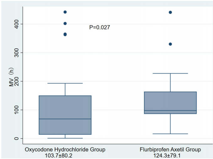 同一亚组中,羟考酮组机械通气时间缩短20.6小时(103.7±80.2h vs 124.3±79.1h,p=0.027),ICU住院时间显著减少(p=0.044)。