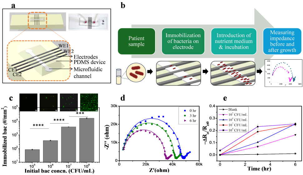 印度理工学院马德拉斯分校(Indian Institute of Technology Madras)的Saranya Gopalakrishnan和Diksha Mall等研究人员在《Scientific Reports》发表创新成果,开发出基于电化学阻抗谱(EIS)的微流控检测装置(e-μD)。该装置采用低成本的碳印刷电极和稀释胰蛋白胨培养基(10% TNM),通过监测细菌生长引起的电荷转移电阻(Rct)变化,3小时内即可完成药敏检测,检测限低至84 cells/mm2。研究证实该方法适用于革兰阴性菌(大肠杆菌ATCC 25922)和革兰阳性菌(枯草芽孢杆菌ATCC 6051),并能准确判断氨苄青霉素(ampicillin)和四环素(tetracycline)的敏感性,在尿液样本中同样表现优异。