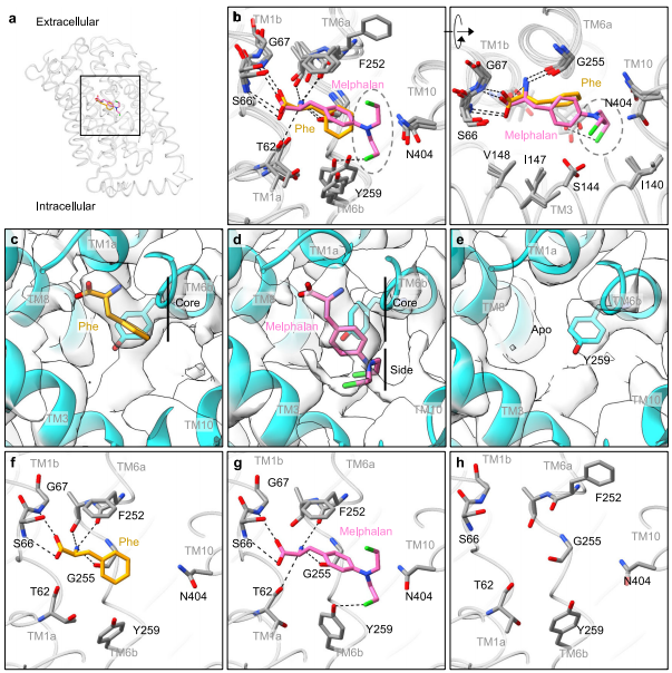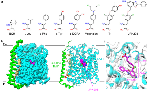 来自马克斯·普朗克生物物理研究所(Max Planck Institute of Biophysics)等机构的研究团队通过冷冻电镜技术,成功解析了LAT1与不同配体结合的六种高分辨率结构,包括抗癌药物JPH203(又称nanvuranlat)、经典抑制剂BCH以及天然底物L-苯丙氨酸(L-Phe)等。这些结构揭示了LAT1在三种不同构象下的精细变化,为理解其转运和抑制机制提供了原子水平的见解。这项突破性研究发表在《Nature Communications》上,为开发新一代抗癌药物奠定了重要基础。