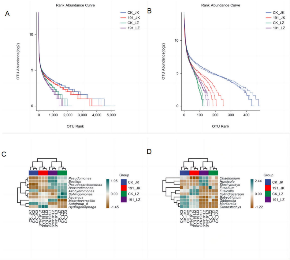 高通量测序显示SYN-191处理显著改变根际微生物组成(图4)。在连作土壤中,有益菌Pseudomonas相对丰度增加31.47%,病原菌Fusarium降低17.61%,形成更健康的微生物网络。