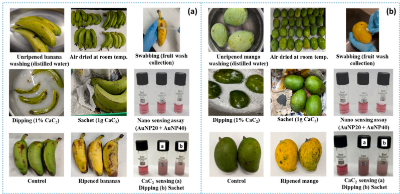 研究人员采用紫外-可见分光光度计(UV-Vis)、傅里叶变换红外光谱(FTIR)、高分辨透射电镜(HR-TEM)和X射线衍射(XRD)等技术,系统研究了L-半胱氨酸功能化金纳米粒子的表征及其与CaC2的相互作用机制。通过采集市售芒果和香蕉样品,建立人工催熟模型,验证了该传感技术的实际应用效果。