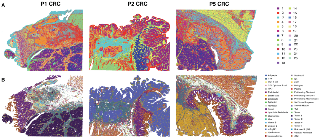 图1. 利用Visium HD绘制结直肠癌(CRC)样本的空间图谱可以揭示高分辨率且准确的转录本映射。A. 在8 µm分析单位上绘制三个CRC样本(P1 CRC、P2 CRC和P5 CRC)的空间图谱,根据无监督聚类进行着色。B. 在8 µm分析单位上绘制同样三个CRC样本的空间图谱,根据解卷积单细胞参考数据集后预测的细胞类型进行着色。图片来源:Oliveira MF等人论文中的图3A、B (1)。CC BY-ND 4.0.