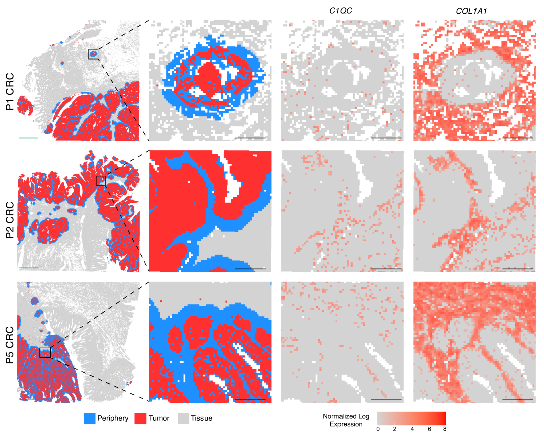 图2. 每张CRC切片中肿瘤周边的细胞组成。标注为肿瘤细胞的8 μm分析单位以红色显示,肿瘤周边50 µm范围的分析单位以蓝色显示。各行对应三个不同的样本。第一列显示6.5 x 6.5 mm的捕获区域,第二列显示放大后的视图,第三列显示C1QC(巨噬细胞)的对应表达,第四列显示COL1A1(成纤维细胞)的对应表达。图片来源:Oliveira MF等人论文中的图4A (1)。CC BY-ND 4.0.