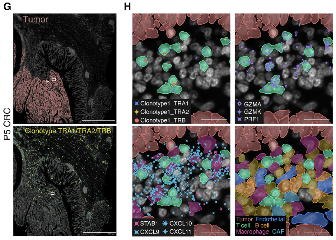 图3. Xenium原位分析证实了巨噬细胞亚型和克隆扩增T细胞在肿瘤微环境中的存在和定位。G. 克隆型TRA1/TRA2/TRB在P5 CRC样本中的联合表达。H. 克隆扩增的CD8细胞毒性T细胞紧挨着肿瘤细胞并驻留在CXCL9/CXCL10/CXCL11病灶内。图片来源:Oliveira MF等人论文中的图7G、H (1)。CC BY-ND 4.0.