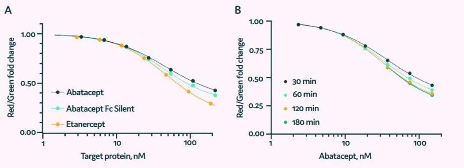 通过基于微孔板读板机的FRET信号测定验证Cyto-Cellect®Fc融合探针检测人Fc融合蛋白的表现,数据显示Abatacept和Etanercept浓度的增加会导致FRET反应的降低,这与这些分子从受体探针中置换FRET供体是一致的。重要的是,Abatacept中的Fc沉默突变不会影响FRET反应(图3A)。将Abatacept作为靶分子,观察随时间变化的FRET反应,发现30分钟的短期孵育足以诱导50%的变化(图3B)。