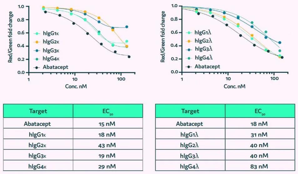 由于所测试的市售Fc融合蛋白含有人IgG1 Fc结构域,因此使用市售人IgG1-4抗体测试了Cyto-Cellect®Fc融合试剂盒检测其他IgG Fc结构域的能力。Cyto-Cellect®Fc融合探针对商业IgG1-4κ(图4左)和IgG14λ(图4右)显示出剂量依赖性反应,与Abatacept相比,EC50值更高,表明Fc融合蛋白可以比母体IgG分子更有效地与供体探针竞争。有趣的是,还观察到对人类IgGκ和λ分子的反应存在差异,尤其是在IgG1、3和4κ的情况下,反应稳定在约66 nM。对于相应的IgGλ亚类,没有观察到这一点。
