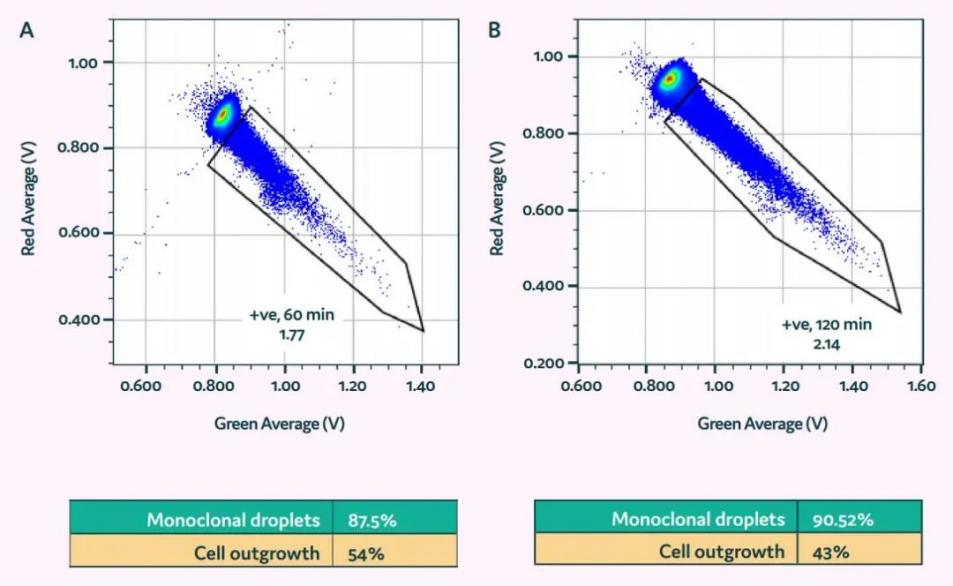 细胞孵育1 h后,分泌Fc融合蛋白的CHO细胞的FRET信号减弱(图5A,孵育1h)。继续增加细胞孵育时间可以提高门控群体的检测率(图5B,孵育2h)。随后将分选的皮滴分配到微孔板中,并监测细胞生长2周。数据显示,分配的细胞仍然存活并生长成菌落。随后对>600个菌落进行筛选,结果显示89.8%的克隆分泌所需的Fc融合蛋白。