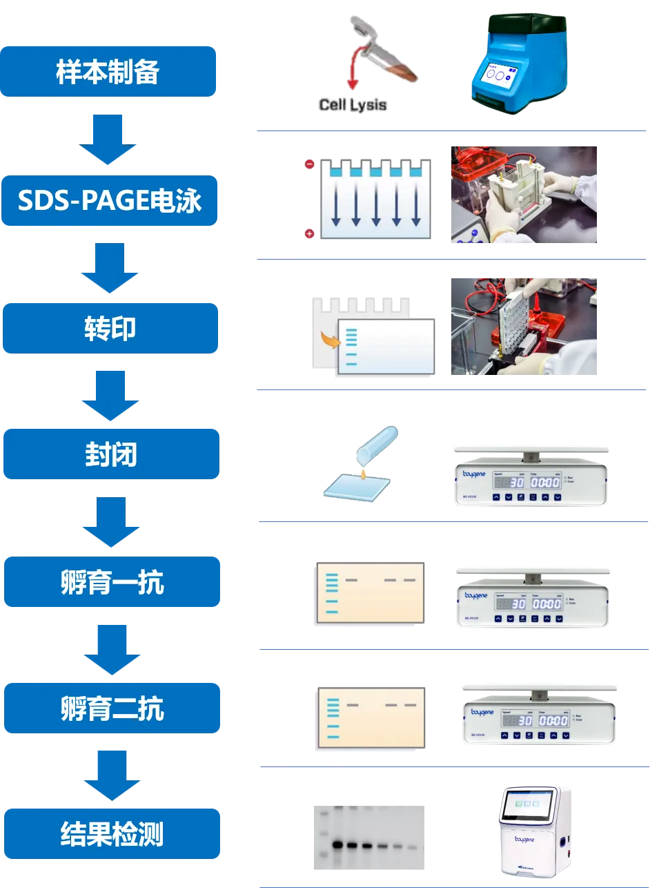 蛋⽩质印迹技术(免疫印迹实验)⼜称为Western Blot。它是分⼦⽣物学、⽣物化学和免疫遗传学中常⽤的⼀种实验⽅法。Western Blot主要⽤于检测或分析蛋⽩,应⽤领域集中在基因表达研究、抗体活性检测和疾病诊断等。Western Blot整个流程可分为如下图所示: