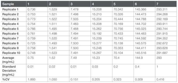 1、浓度锚定能力:针对 BSA 等蛋白,检测范围横跨0.03–820 mg/mL,低浓度区间(0.03–10 mg/mL)标准偏差控制在±0.03 mg/mL以内(实测最低0.007 mg/mL),高浓度段(>10 mg/mL)变异系数≤2%(典型值 0.2–0.4%),10 次重复检测数据离散度低于传统仪器 50% 以上。