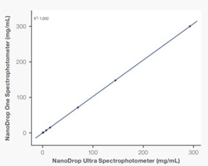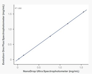 2、多维验证可靠性:与比色皿式仪器 Evolution One Plus对比,低至0.03mg/mL的痕量蛋白检测偏差仅0.005mg/mL;与 NanoDrop One的全浓度相关性达R²=1.000,证实跨平台数据等效性。